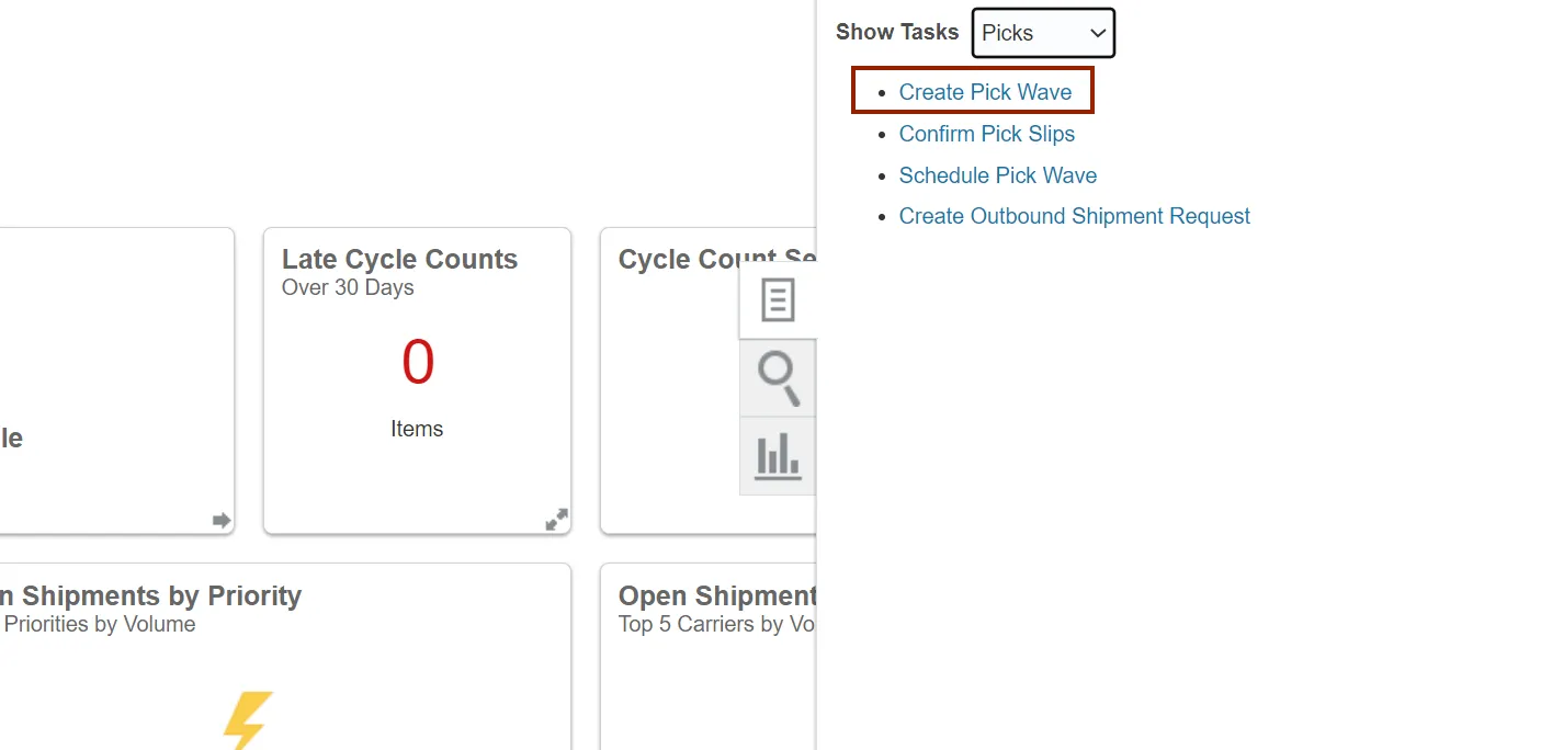 Step 4. Click the Tasks icon and select Picks from the Show Tasks drop-down choice list.