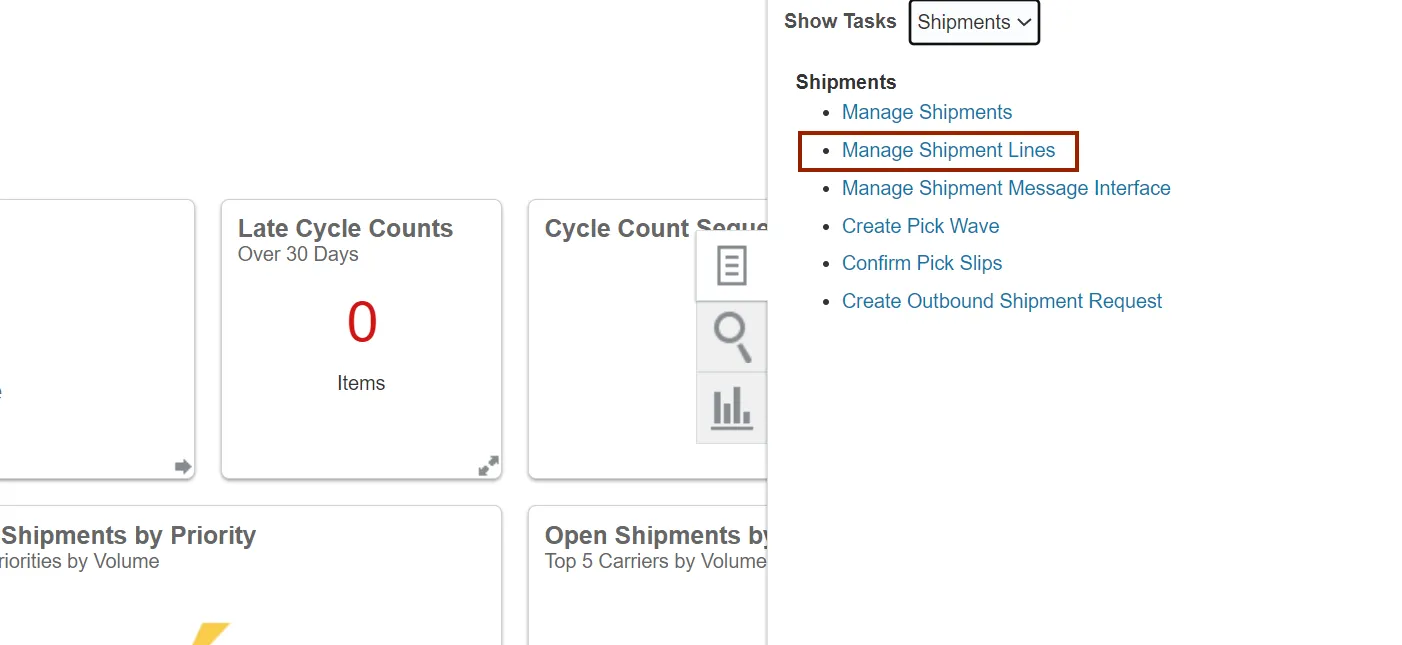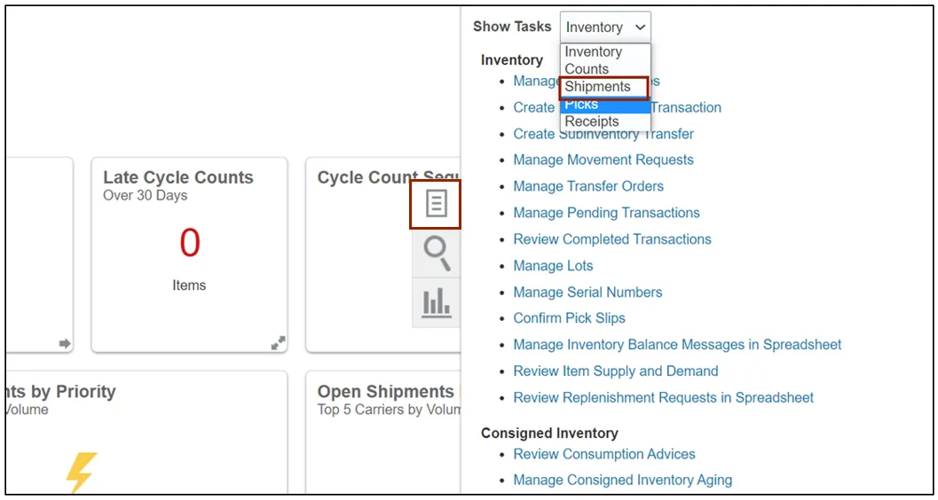 Step 8. To verify the pick wave was released, on the Inventory Management Page, click the Tasks icon and select Shipments from the Show Tasks drop-down choice list.