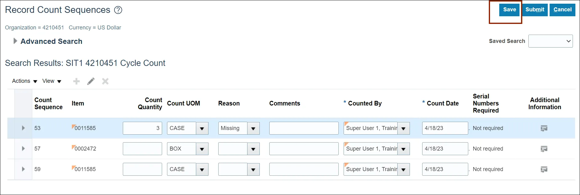 Once submitted, the Cycle Count Approver will be notified to approve, reject, or request a recount of this cycle count.
