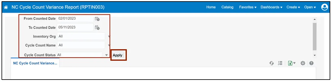 Step 12. Enter the parameters for the report including Inventory Org, Cycle Count Name, and/or Cycle Count Status and click the Apply button.
