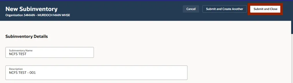 Step 4. Click the Submit and Close button, or click the Submit and Associate Another Item button to add additional items to the selected Subinventory.