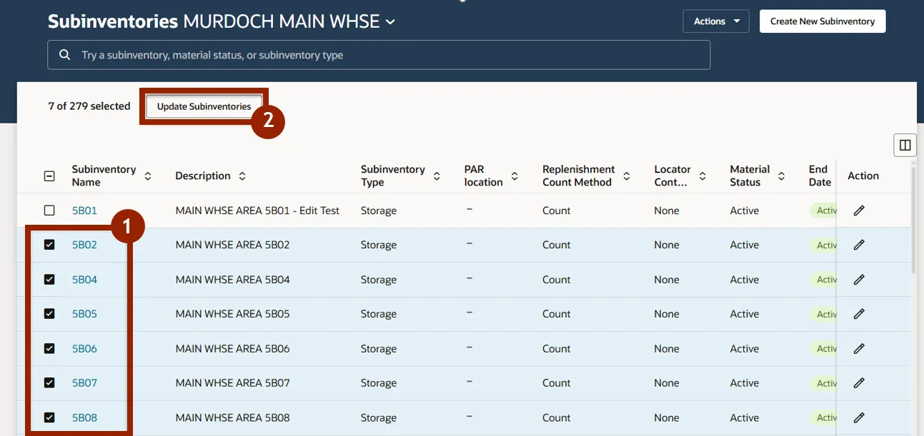 Step 1. Select the selection box next to the Subinventory name of all subinventories being edited.