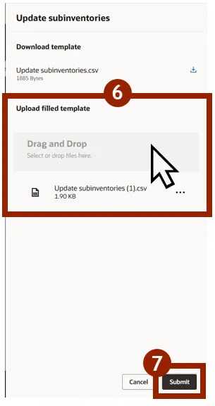 Step 5. Drag and Drop the saved Create Subinventories.csv file from your computer into the Upload filled template section within Drag and Drop field. The file will be visible once completed. Click Submit when the file has been uploaded.