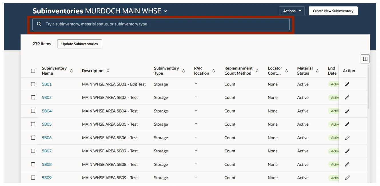 Step 20. The newely created subinventory can be located using the Search Bar.