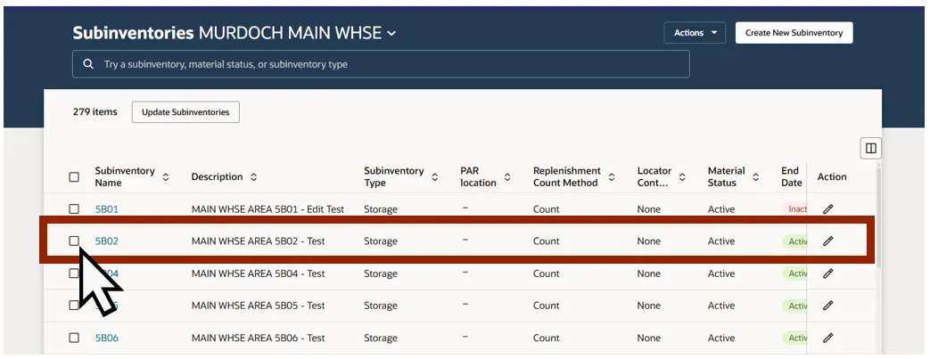 Step 2. Click the corresponding subinventory’s Pencil icon in the Action column.