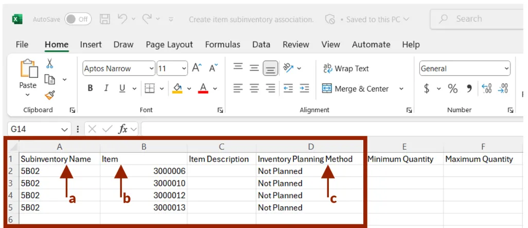 Step 4. Open the downloaded Create item subinventory associations.csv file from your computer. This file will open in EXCEL.