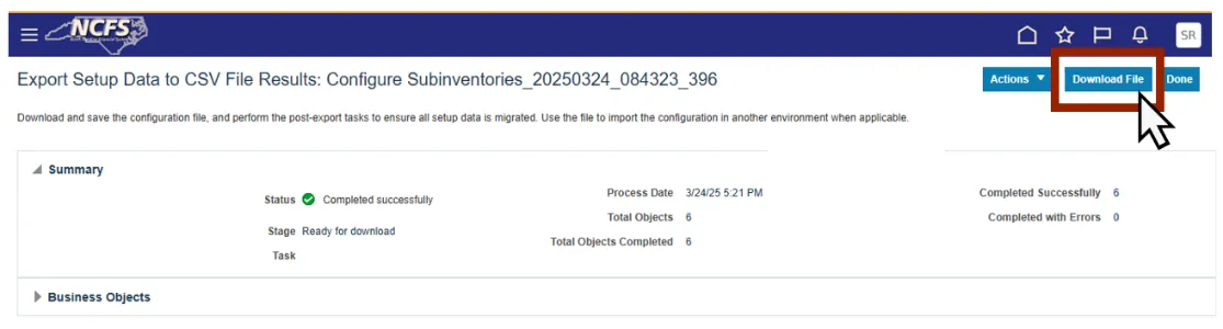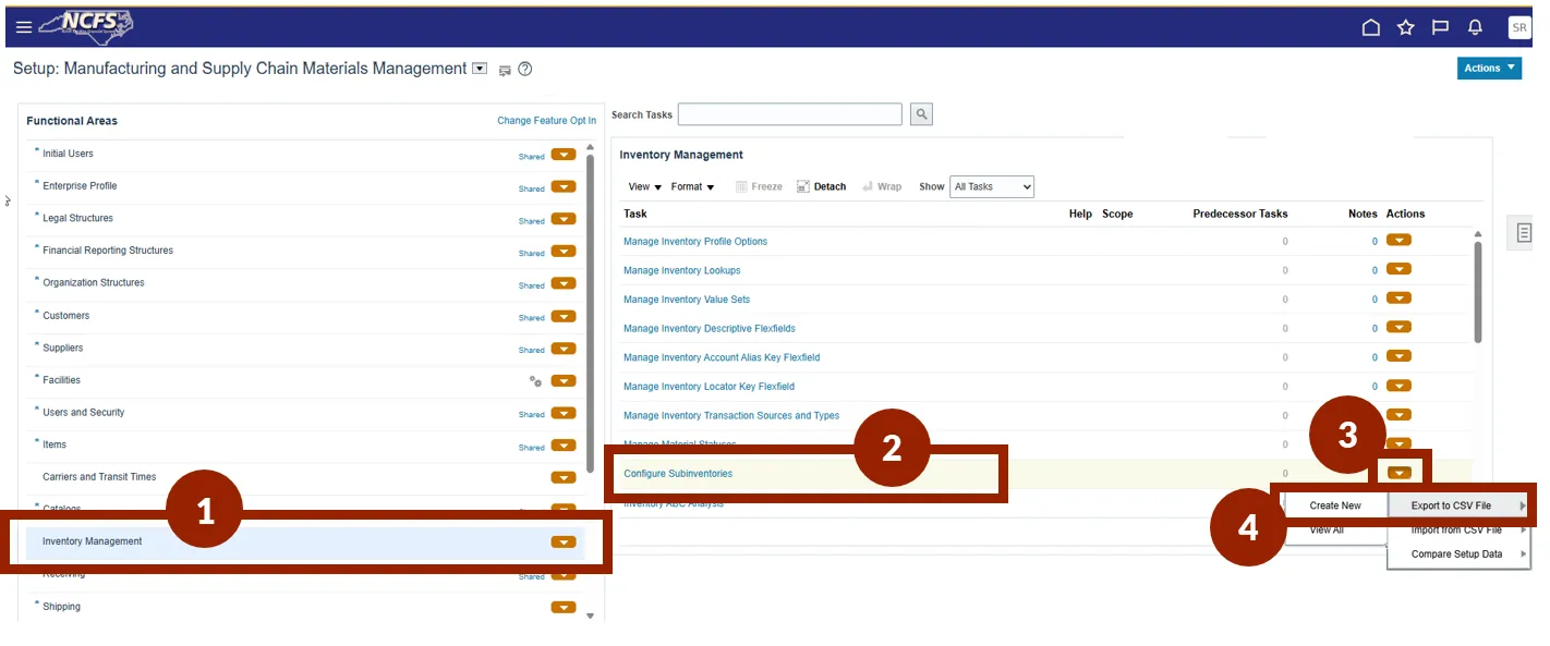 Step 8. Click the Configure Subinventories Actions button, select Export to CSV File, then select Ready for Download X/XX/XX. The file will download.