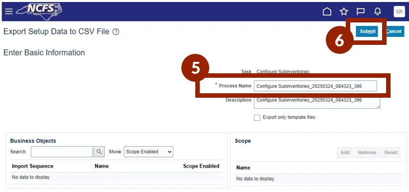 Step 5. On the Export Setup Data to CSV File screen, review the Process Name field.