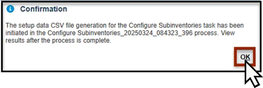Step 7. A Confirmation window will appear, stating that the configure subinventories task has been initiated. Click OK to close the window.