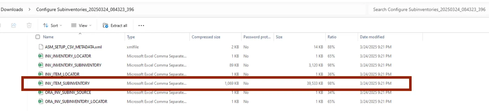 Step 10. Open the downloaded Configure Subinventories_XXXXXXXX_XXXXXX_XXX file. The file contains a collection of six EXCEL spreadsheet files.