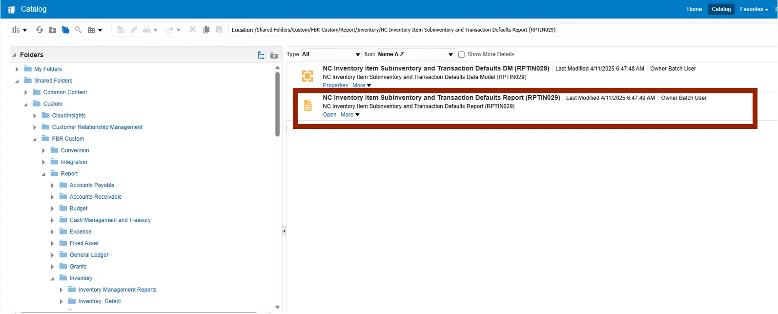 Step 3. In the folders panel select Shared Folders -> Custom -> FBR Custom ->Report ->Inventory -> NC Inventory Item Subinventory and Transaction Defaults Report (RPTIN029).