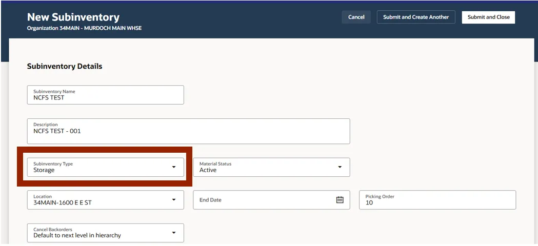 Step 9. On the Subinventory Details screen, complete all mandatory fields.