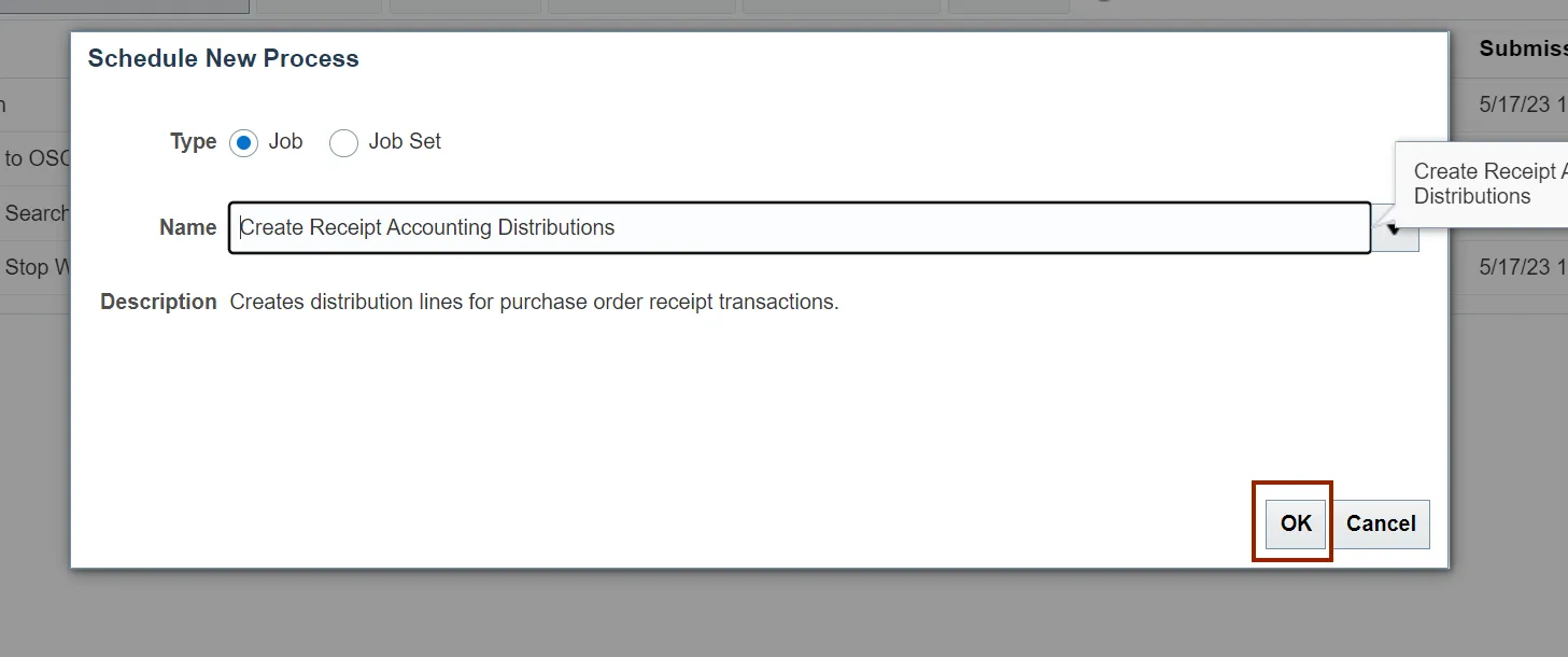In this example, we choose Create Receipt Accounting Distributions. Click the OK button.
