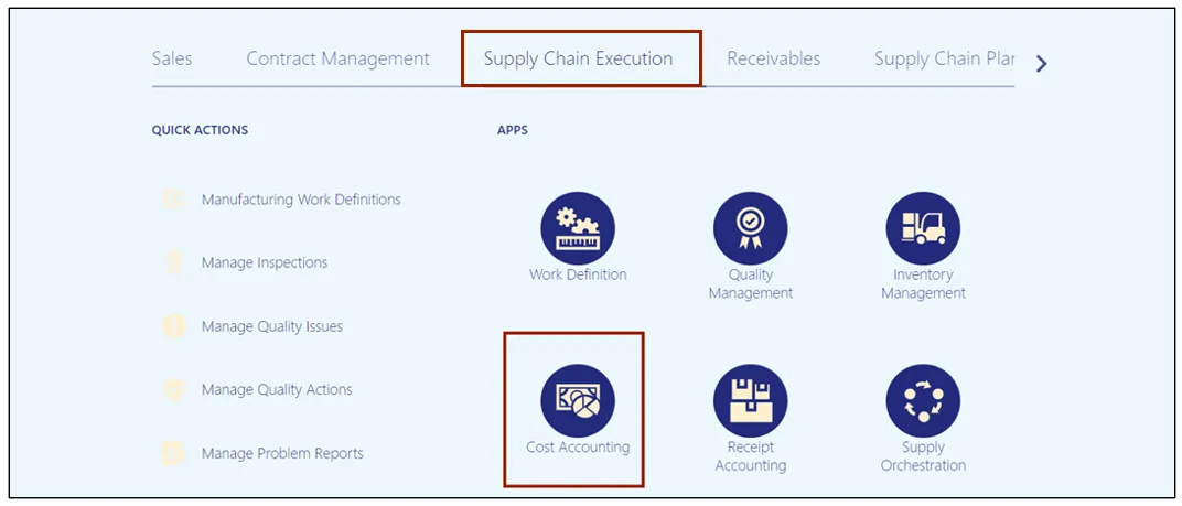 Step 2. On the Home page, under the Supply Chain Execution tab, click the Cost Accounting app.