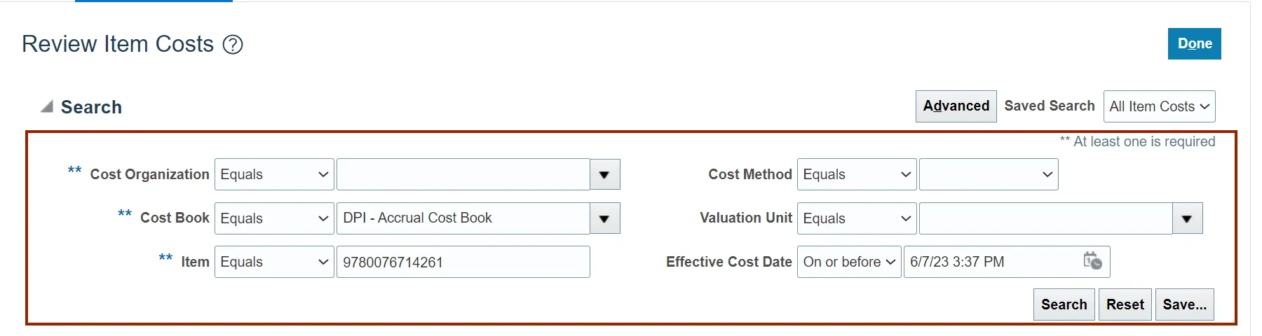 Step 4. On the Review Item Costs page, enter the required details in at least one field marked with [**] in the Search Criteria section and click the Search button.