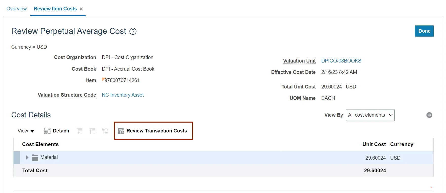 Step 6. On the Review Perpetual Average Cost page, click the Review Transaction Costs button.