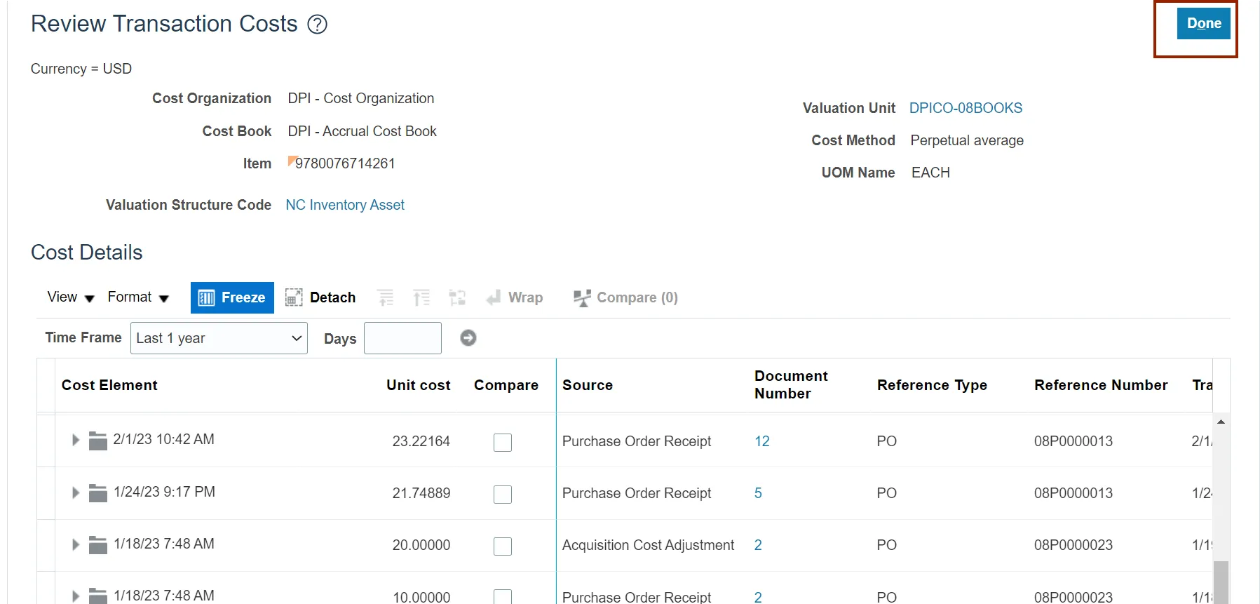 Step 8. Review the Cost Element, Unit cost, Source, Document Number, Reference Type, and Reference Number.