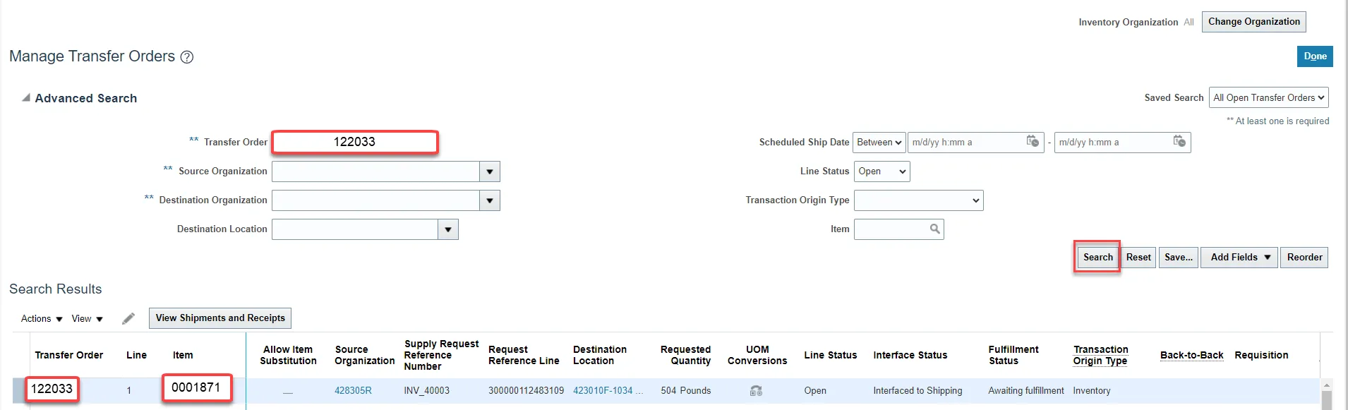 Step 11. Enter the Transfer Order number, click Search and then click on the Transfer order number.