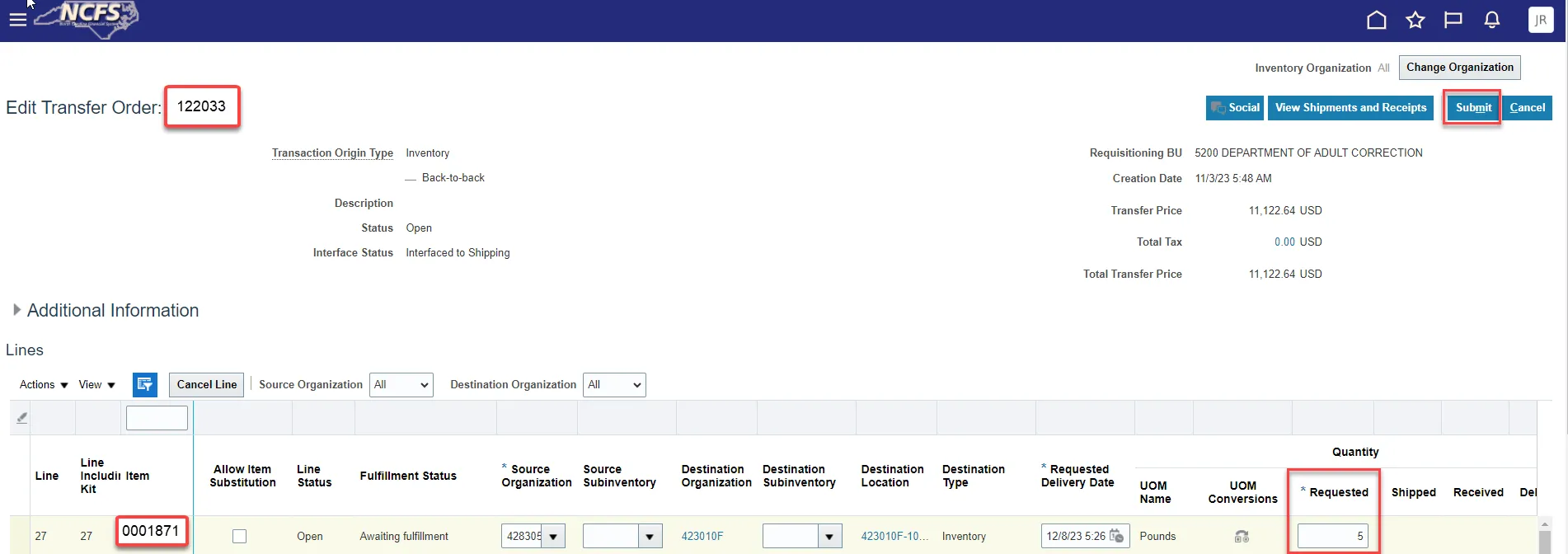 Step 12. Find the Item(s) that were Short Picked and reduce the Requested Quantity to match the Pick Confirmed Quantity. Click Submit.