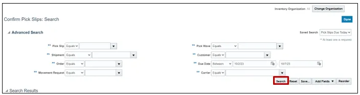 In this example, all pick waves for the week of 10/2 was searched on. Click Search.