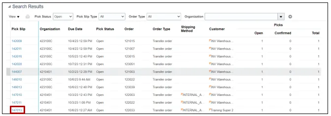 Step 7. Search results will appear towards the bottom on the screen. Find the pick wave and click the Pick Slip link.