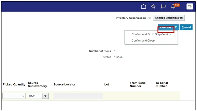Step 8. On the Confirm Pick Slip screen, change the picked quantity to less than the requested quantity and check mark the Ready to Confirm box.