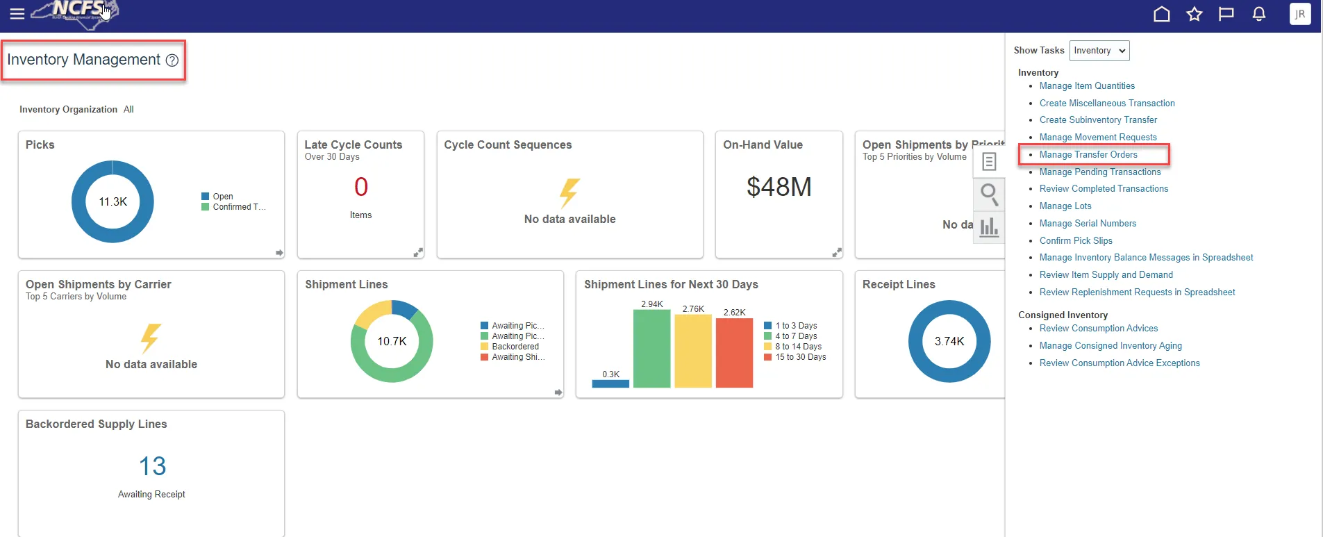 Step 10. Go to Inventory Management and select Manage Transfer Orders from tasks menu.