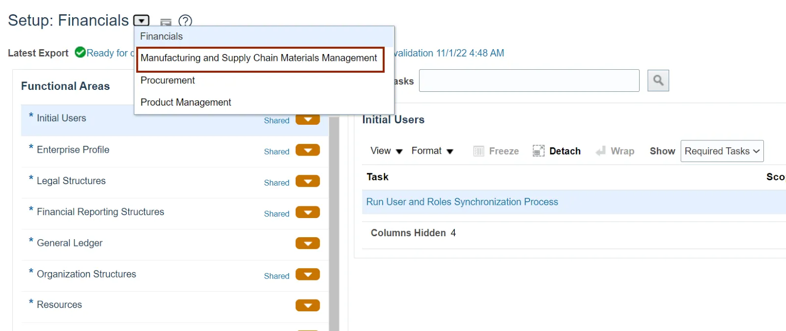 Step 3. Select the Manufacturing and Supply Chain Materials Management option from the Setup: Financials drop-down choice list.