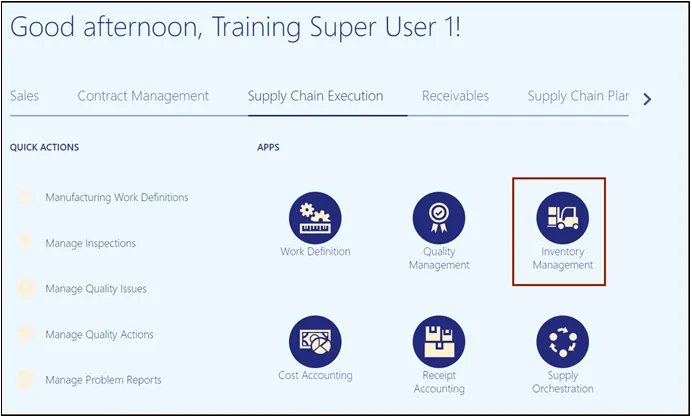 Step 1. On the Home page, under the Supply Chain Execution tab, click the Inventory Management app.