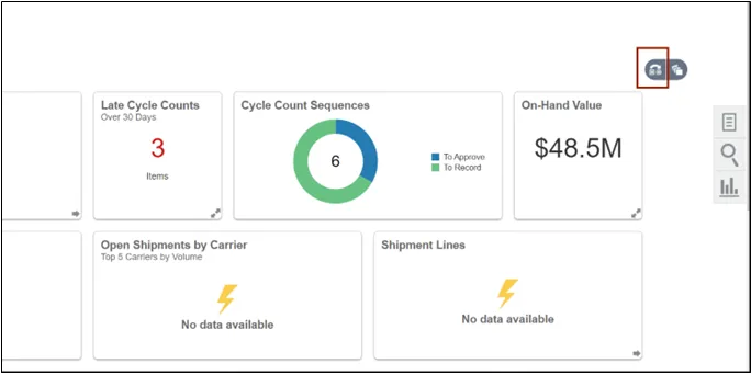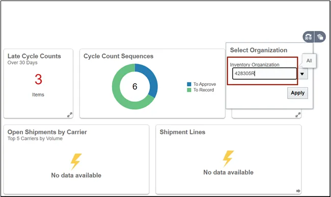 Step 2. On the Inventory Management dashboard, click the View by icon. Click the Inventory Organization drop-down choice list, select the Inventory Organization.