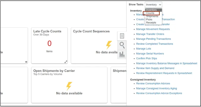 Step 3. Click the Tasks icon. Click the Show Tasks drop-down choice list, then select Counts and click Create Cycle Count.