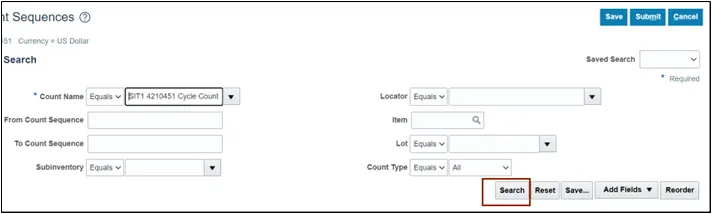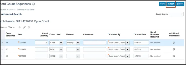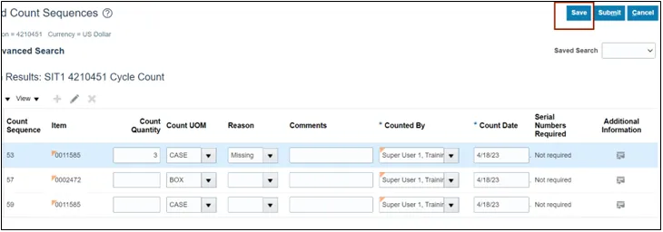 In this example, we entered 4210451 SIT Cycle Count1.
