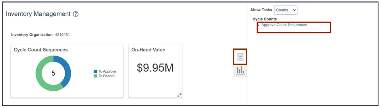 Step 3. Click the Tasks icon. Under the Cycle Counts section, select the Approve Count Sequences link.