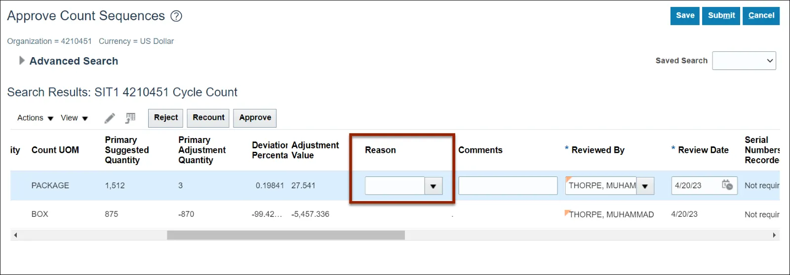 In this example we chose SIT1 4210451 Cycle Count and Pending Approval option from the Approval Status drop-down.
