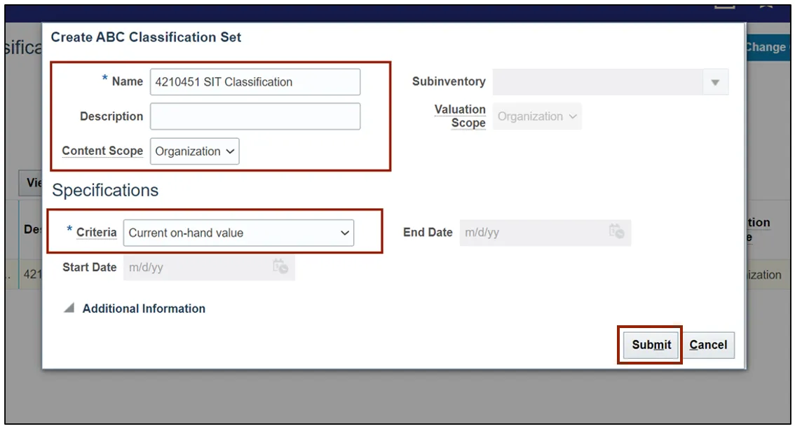 Step 8. Enter the information in Create ABC Classification Set section and the Criteria field. Click the Submit button. This redirects you to the Set-up and Maintenance page.