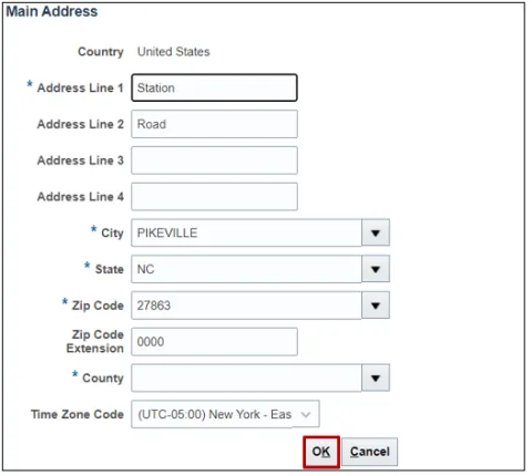 Step 10.    For Main Address updates, make changes to the popup screen in appropriate locations, then click OK.