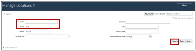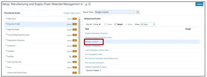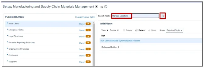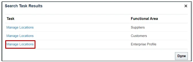 Step 3.    In the Search Tasks field, type Manage Locations then click the Search icon.
