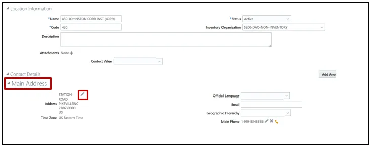 Step 9.    On the Edit Location page, make updates as needed. To change a location address, scroll partway down the page to find Main Address, then click the Edit icon.