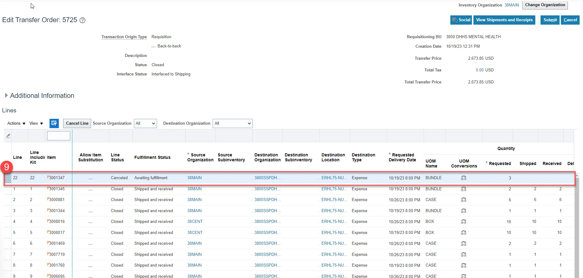 Step 7. Enter the Transfer Order number in the Transfer Order field and change Line Status to blank and click Search to see the Transfer Order Lines.