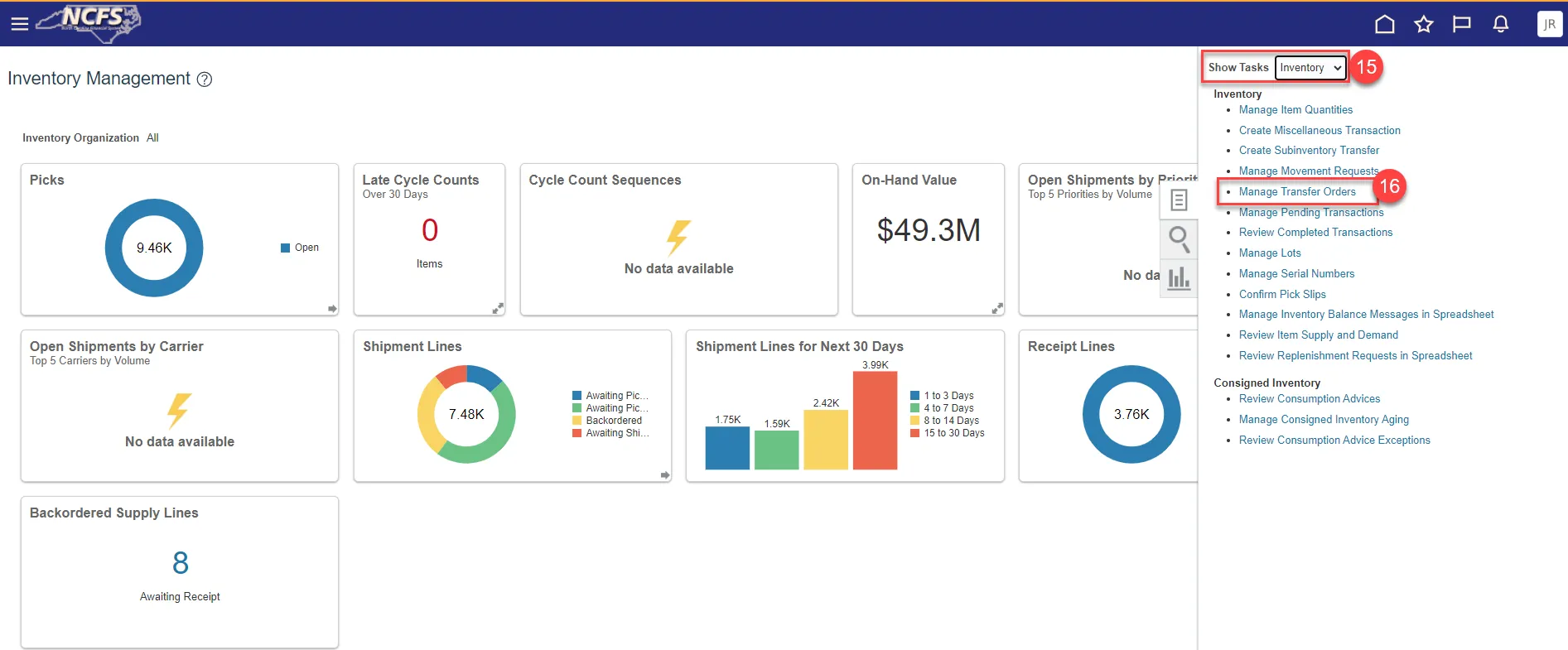 Step 11. Select Inventory under Show Tasks and then select Manage Transfer Orders.