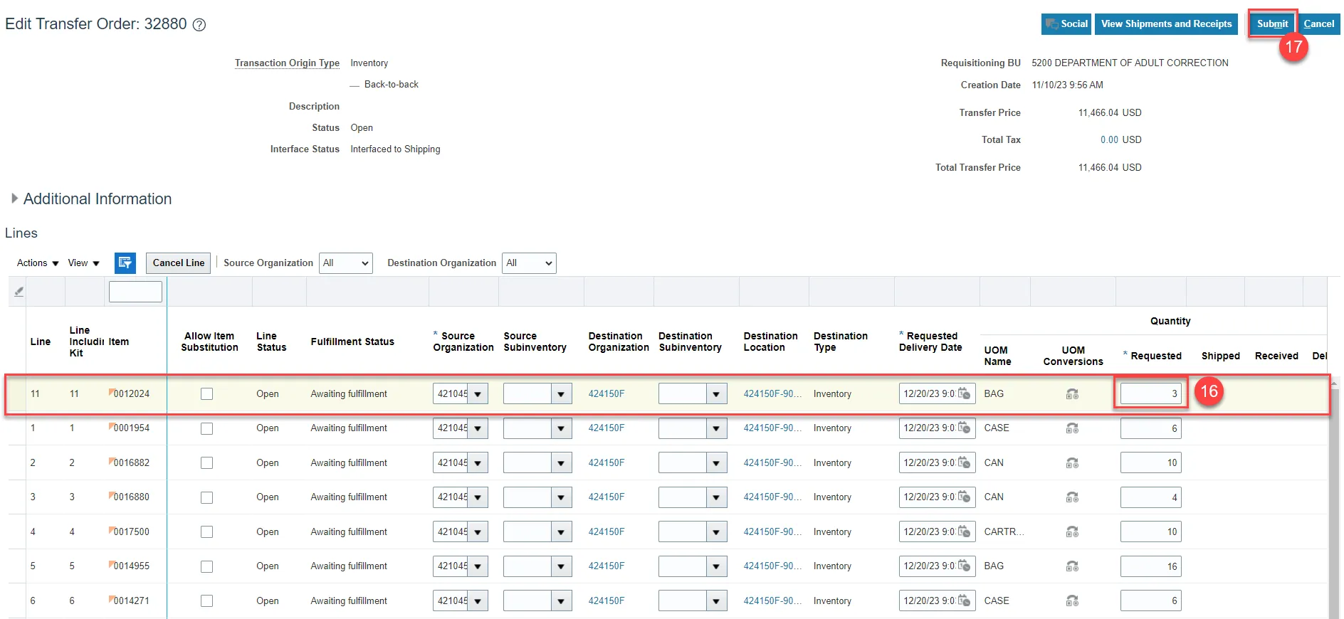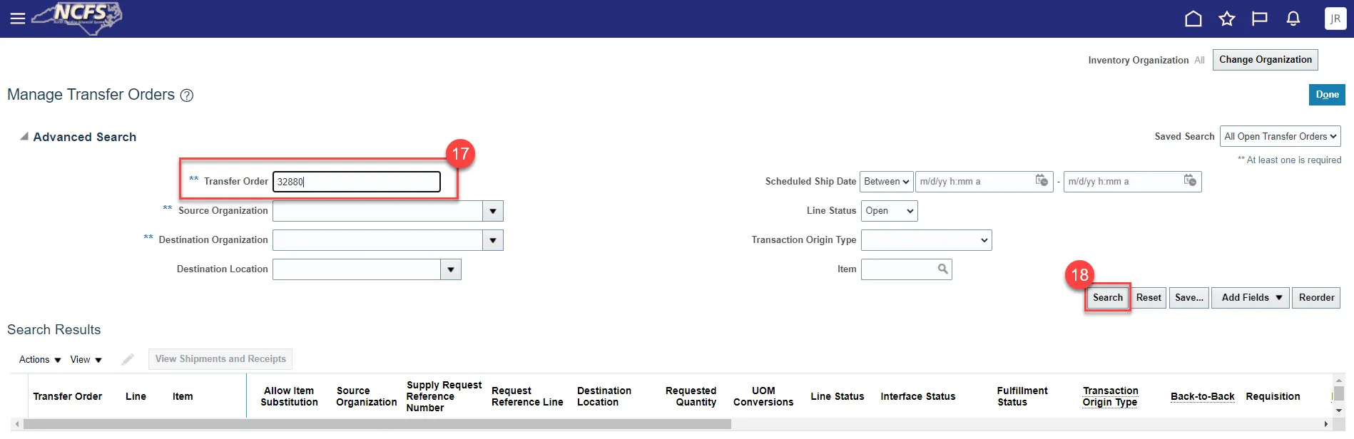 Step 17. Enter the Transfer Order number in the Transfer Order field.