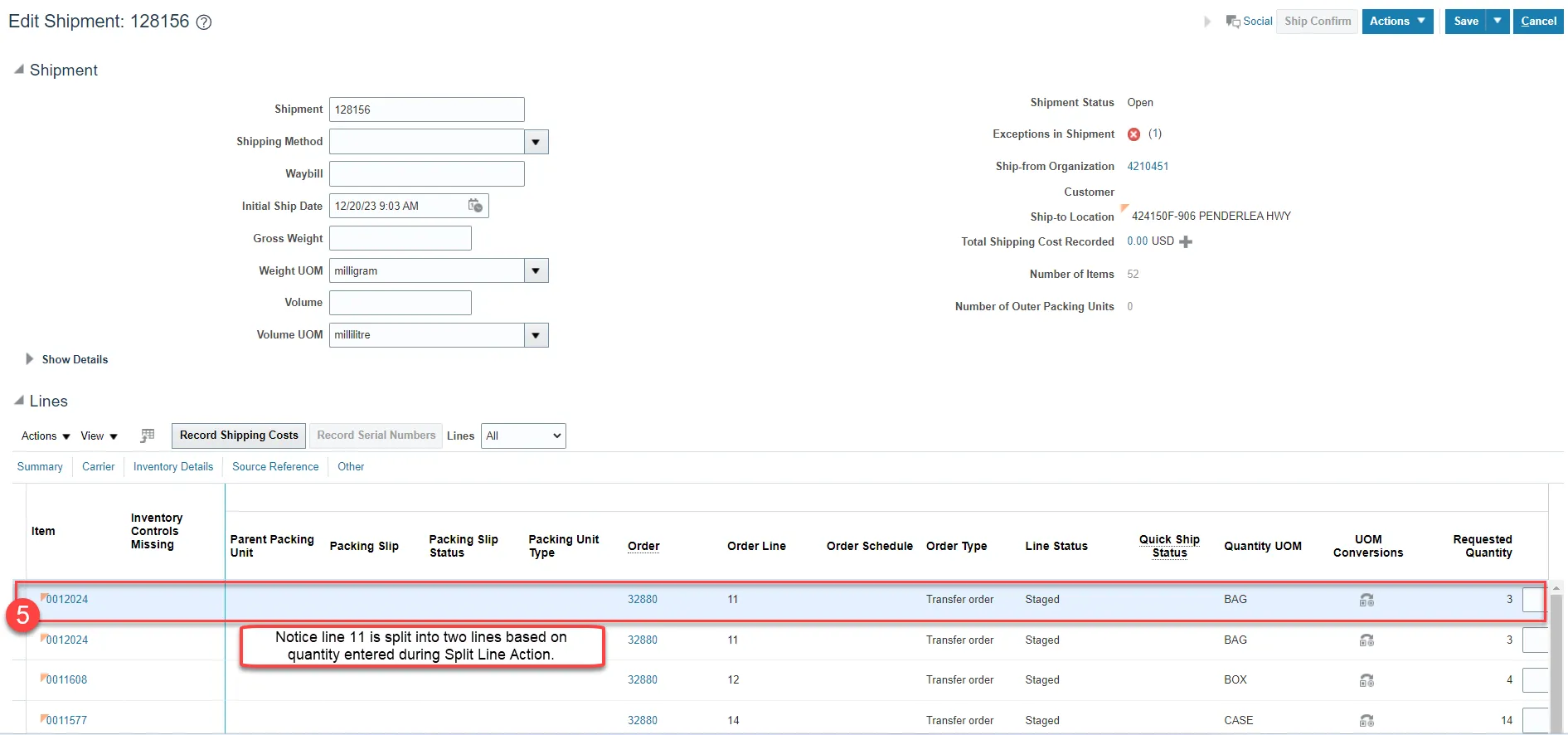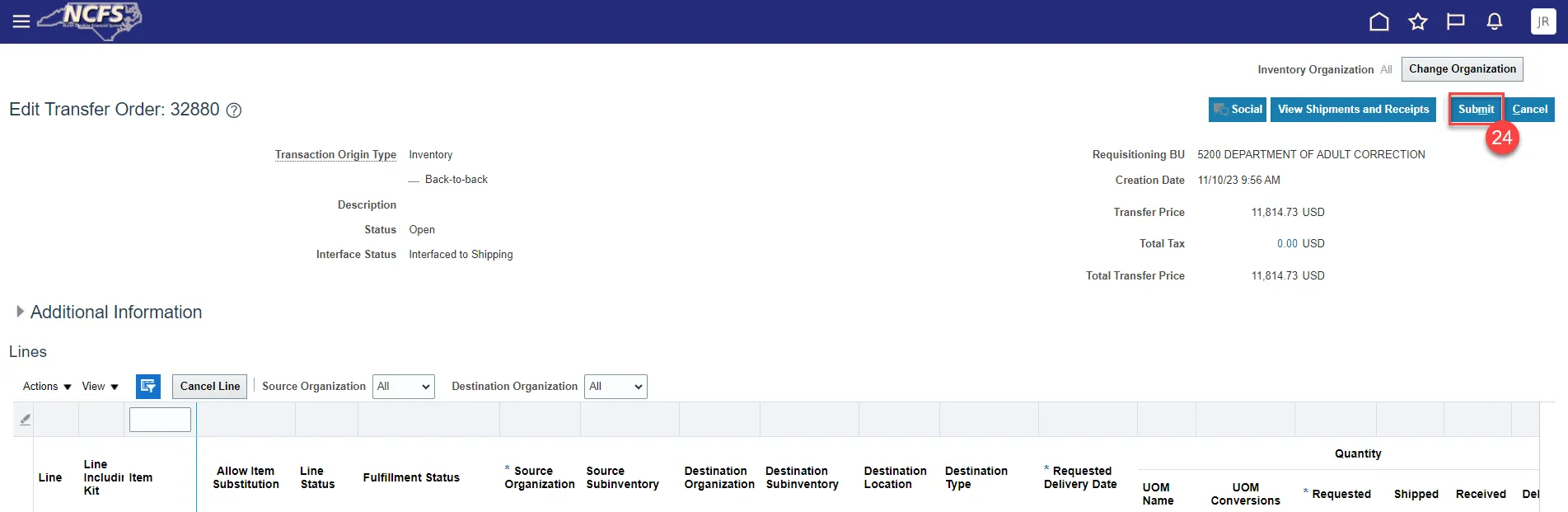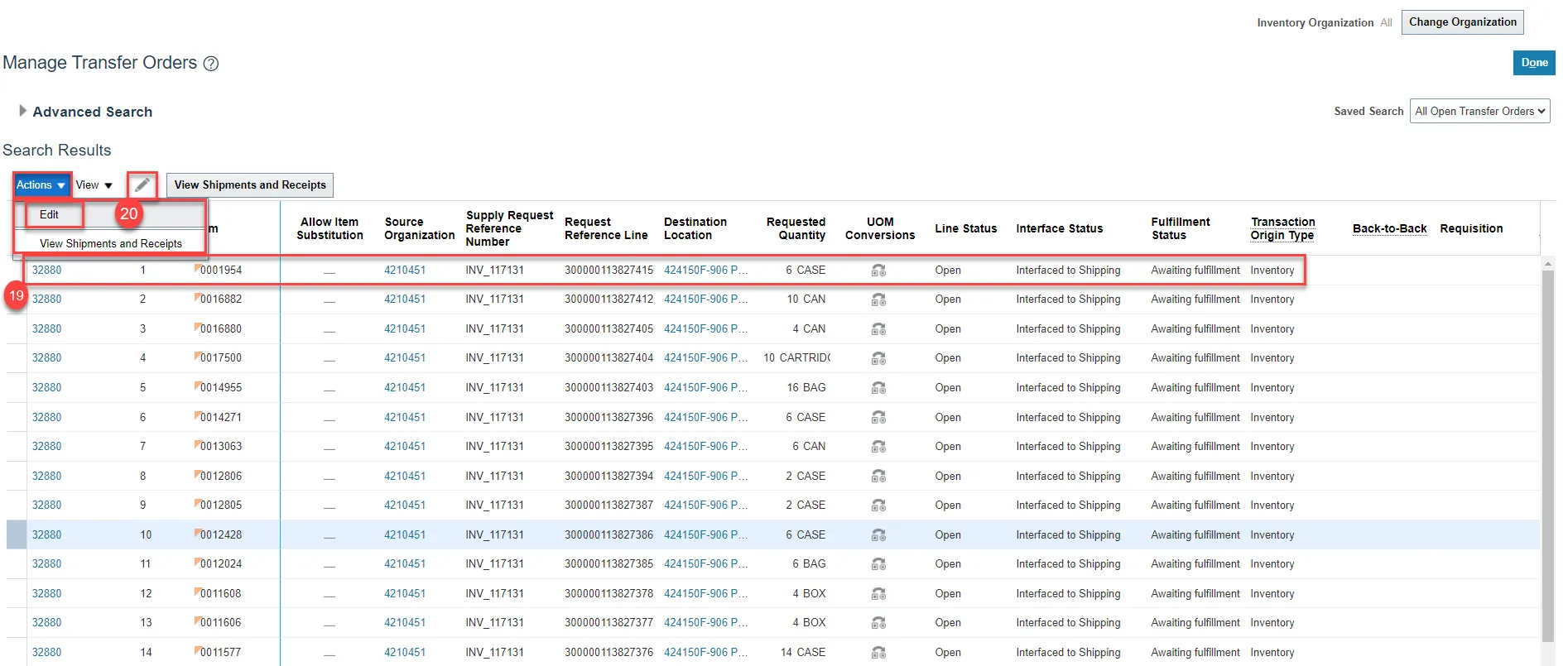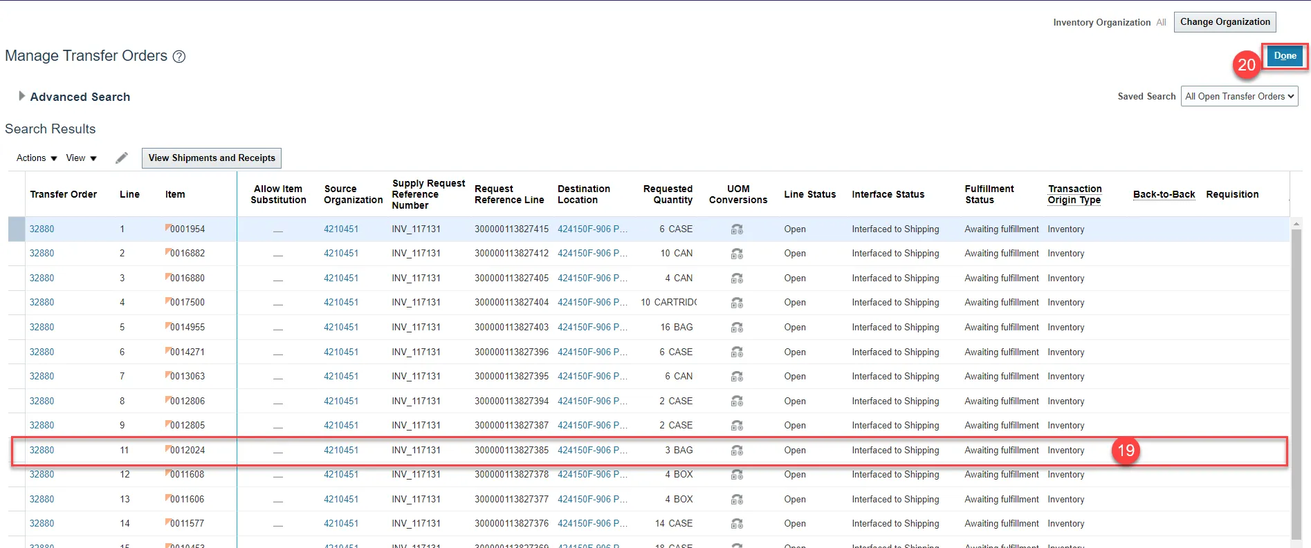 Step 19. The Transfer Order line quantity should now match the Shipment Line quantity.