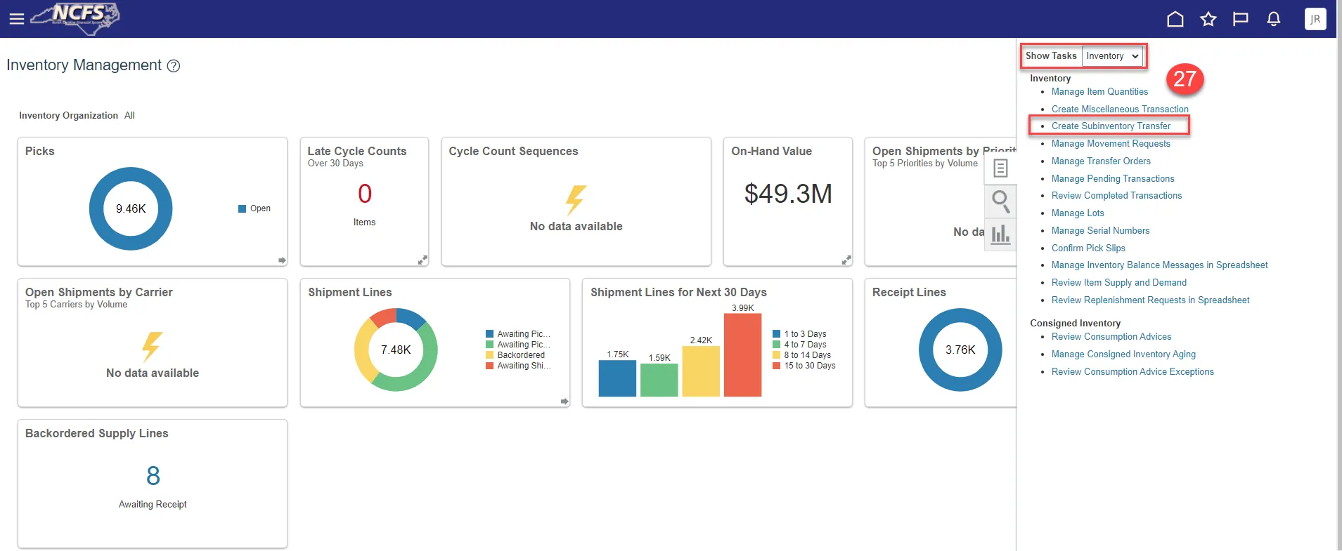 Step 27. Select Inventory under Show Tasks and select Create Subinventory Transfer.