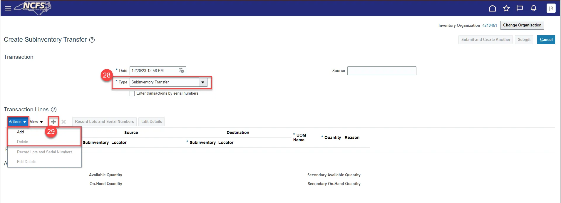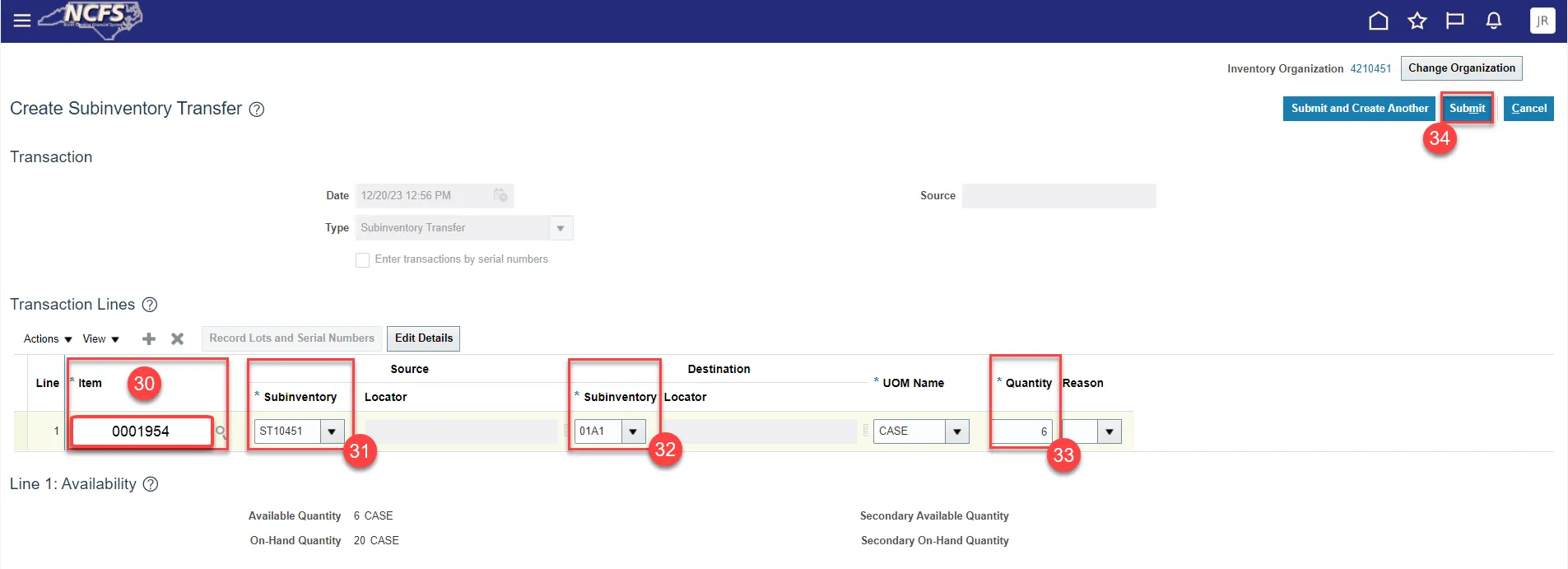 Step 21. Perform Steps 27-35 above to Create a Subinventory Transfer to move the partially deallocated quantity out of the Staging Area back into the Subinventory Area.