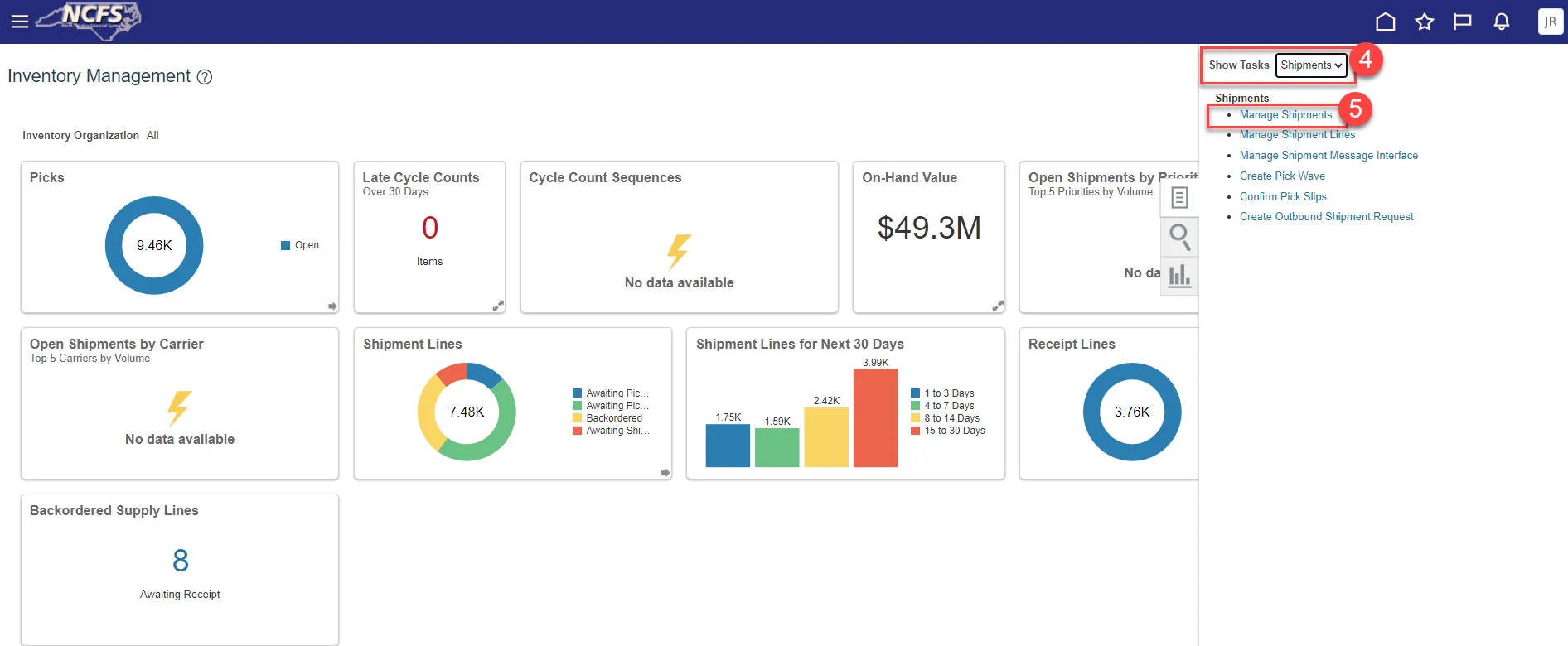 Step 4. Select Shipments from the Show Tasks drop-down menu.