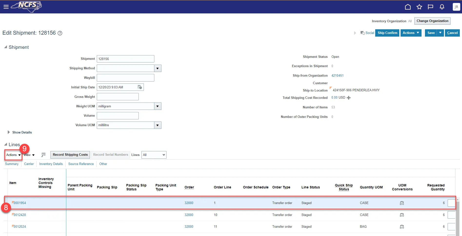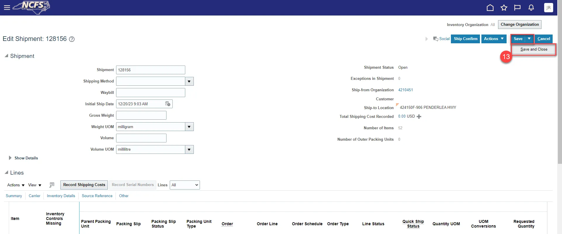 Step 16. Update the Requested Quantity to match the quantity kept on the Shipment Line.