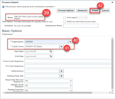 Step 39. Next, run the FBR NC Print Cycle Count Listing Report in Scheduled Processes.