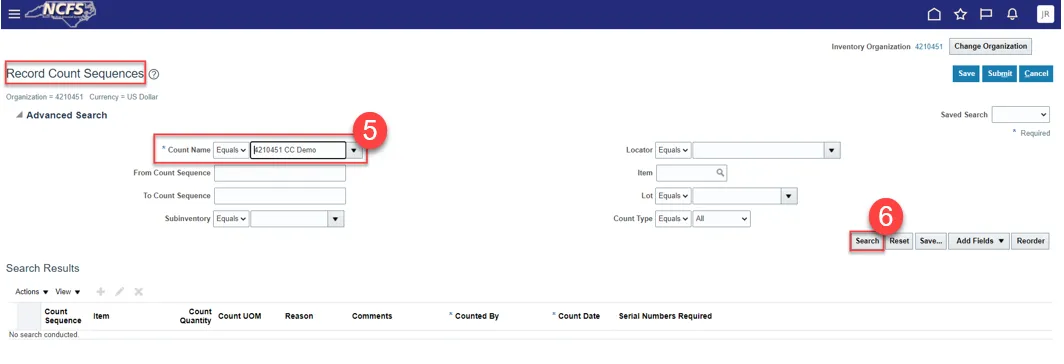 Step 5. Enter the Organization number in the Organization field the cycle count was performed for.