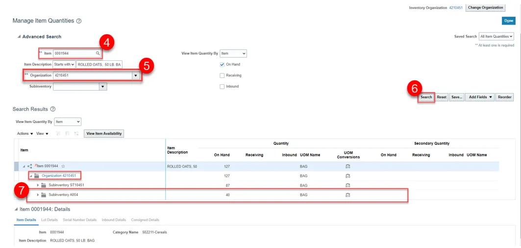 Step 7. Review the item quantity for approved cycle count sequence status.