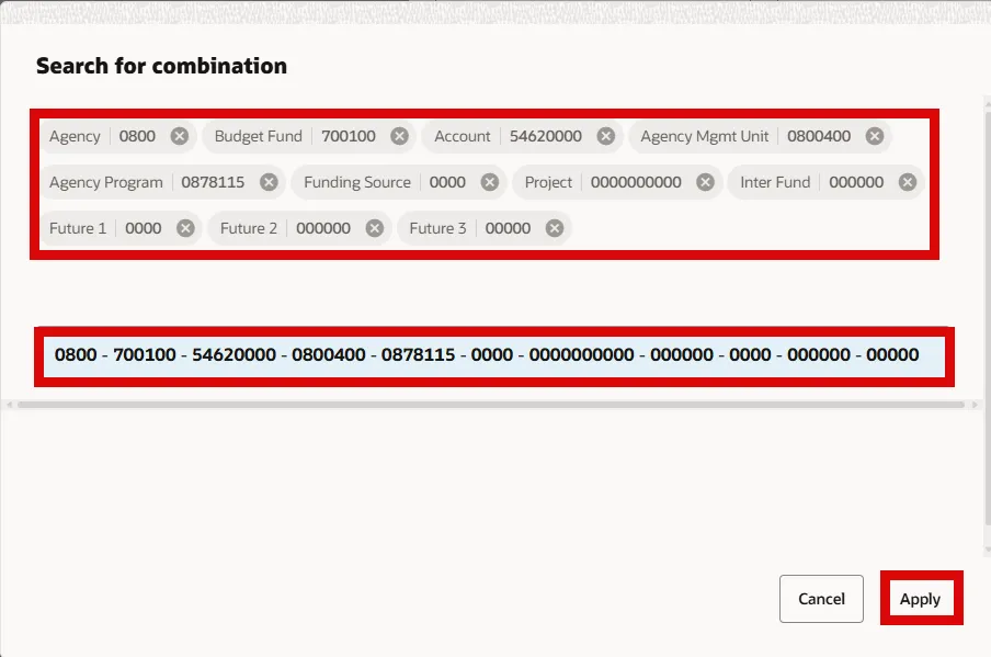 Step 20. Select the Agency, Budget Fund, Account, Agency Mgmt Unit, and Agency Program.